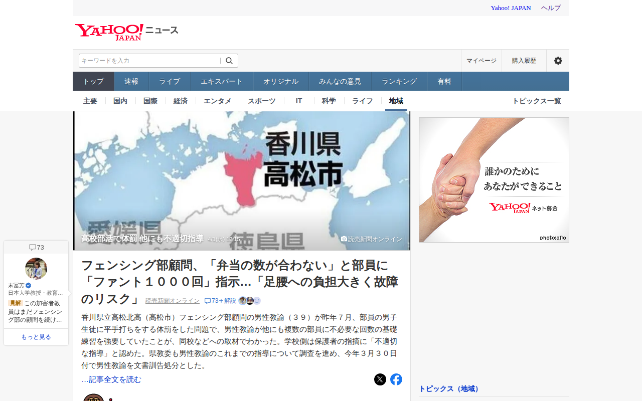 このページは、香川県立高松北高のフェンシング部顧問の男性教諭(39歳)による体罰と不適切指導の問題を報じている。昨年7月に部員の男子生徒に平手打ちをした体罰に加え、弁当の数が合わないことを理由に別の部員に「ファント100...