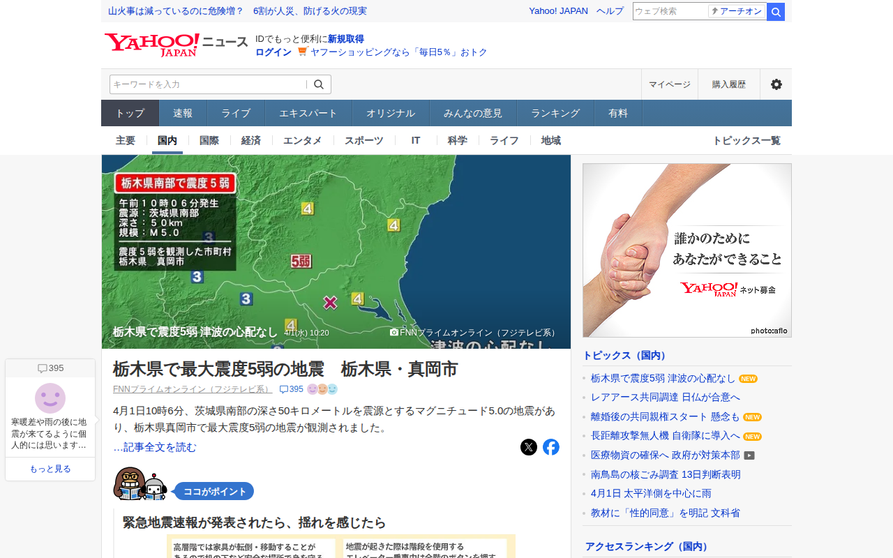 栃木県で震度5弱 津波の心配なし - Yahoo!ニュース