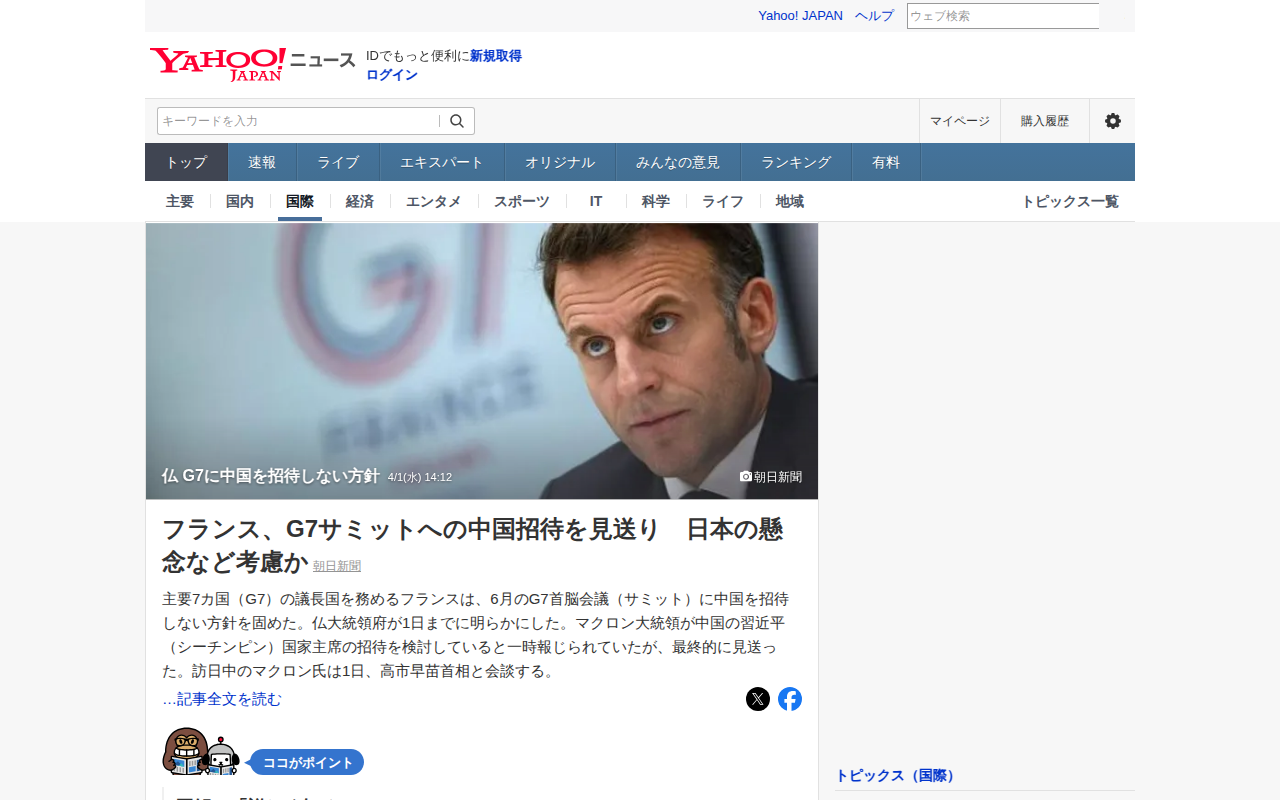 このページは、フランスがG7議長国として6月のサミットに中国を招待しない方針を固めたことを報じています。マクロン大統領が習近平国家主席の招待を一時検討していたと報じられていましたが、最終的に見送られました。日本の懸念が考...