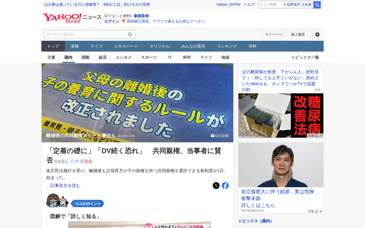 このページは、2024年4月1日に施行された改正民法による離婚後の共同親権制度の導入について報じたYahoo!ニュースの記事です。離婚後、父母双方が子どもの親権を持つ共同親権を選択できる新制度が始まりました。78年ぶりの...