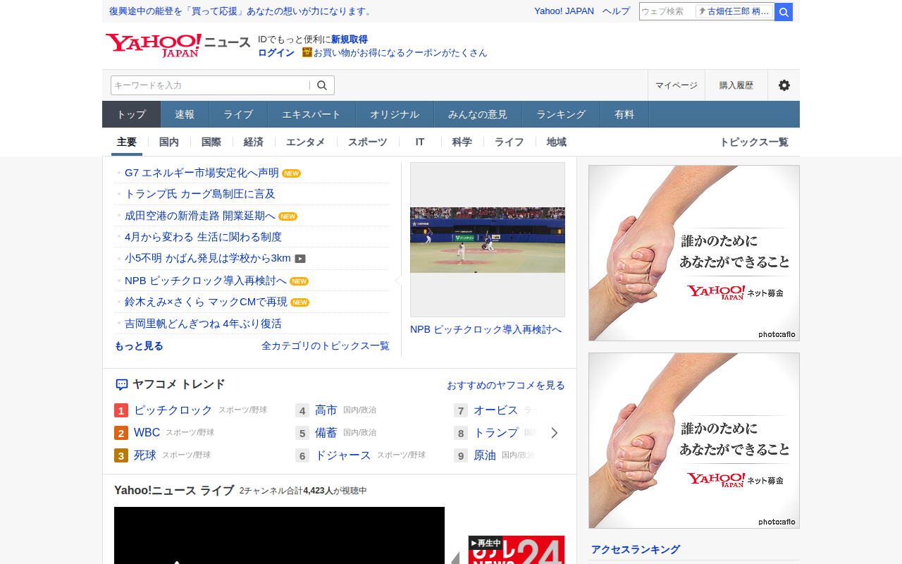 このページはYahoo!ニュースのトップページです。能登復興支援の呼びかけや、G7エネルギー市場安定化、成田空港新滑走路開業延期、4月からの制度変更など国内外の主要ニュースが掲載されています。スポーツ・エンタメ・経済など...