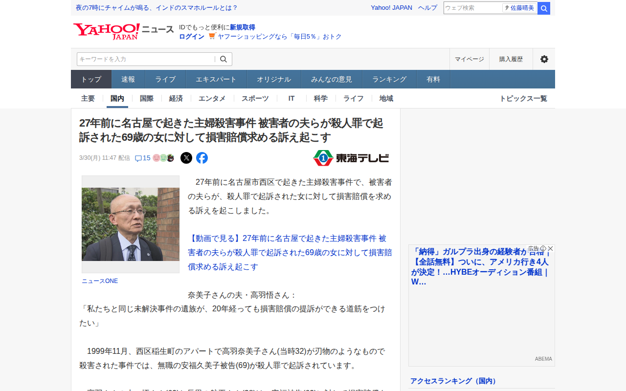 27年前に名古屋で起きた主婦殺害事件 被害者の夫らが殺人罪で起訴された69歳の女に対して損害賠償求める訴え起こす(東海テレビ) - Yahoo!ニュース