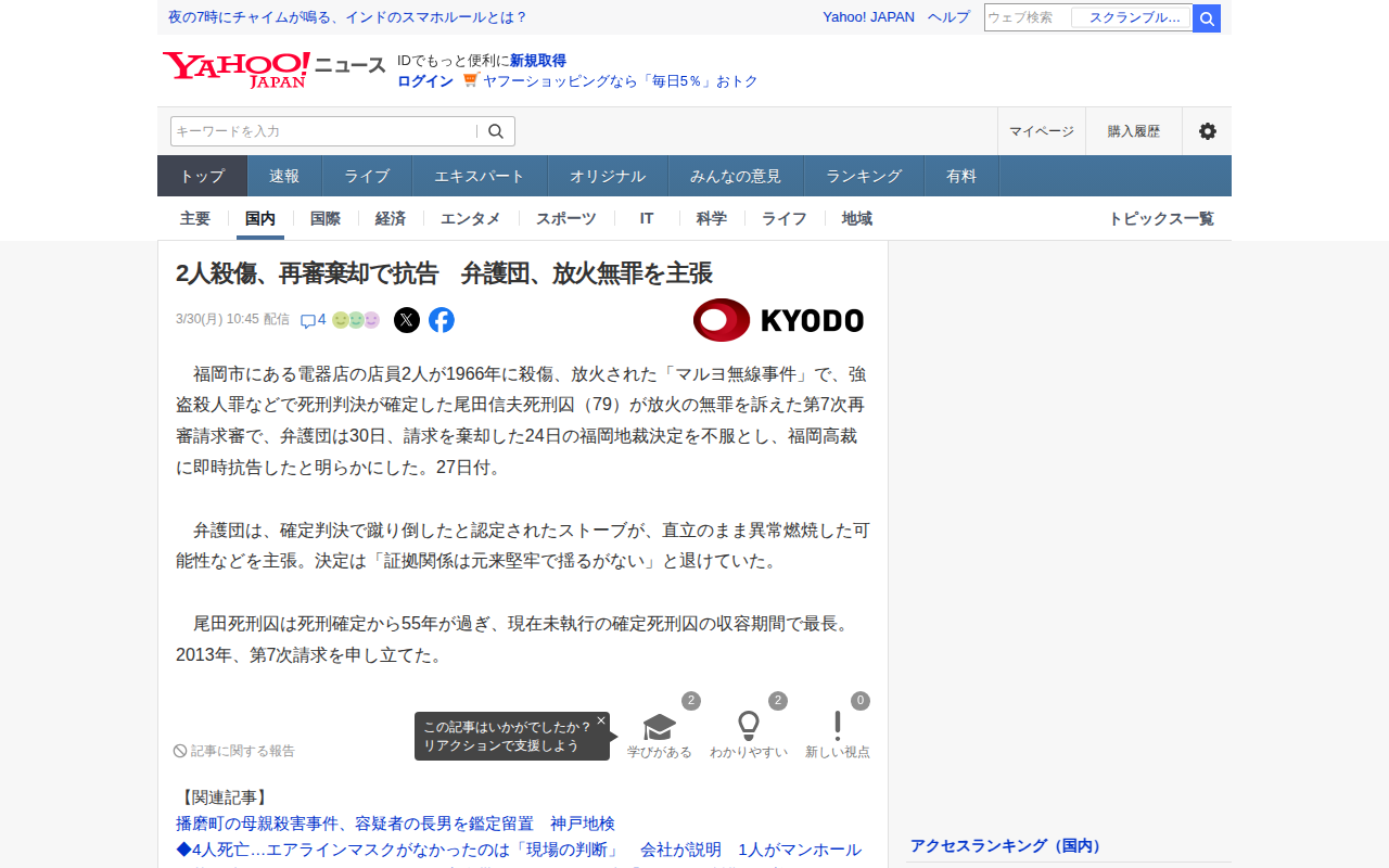 2人殺傷、再審棄却で抗告 弁護団、放火無罪を主張(共同通信) - Yahoo!ニュース