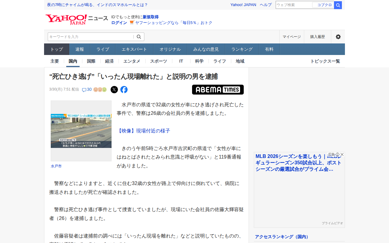 このページは、茨城県水戸市で2024年3月29日午前5時頃に発生した死亡ひき逃げ事件を報道しています。32歳の女性が県道で乗用車にはねられて死亡し、26歳の会社員の男が逮捕されました。容疑者は事故現場から一度立ち去った後...
