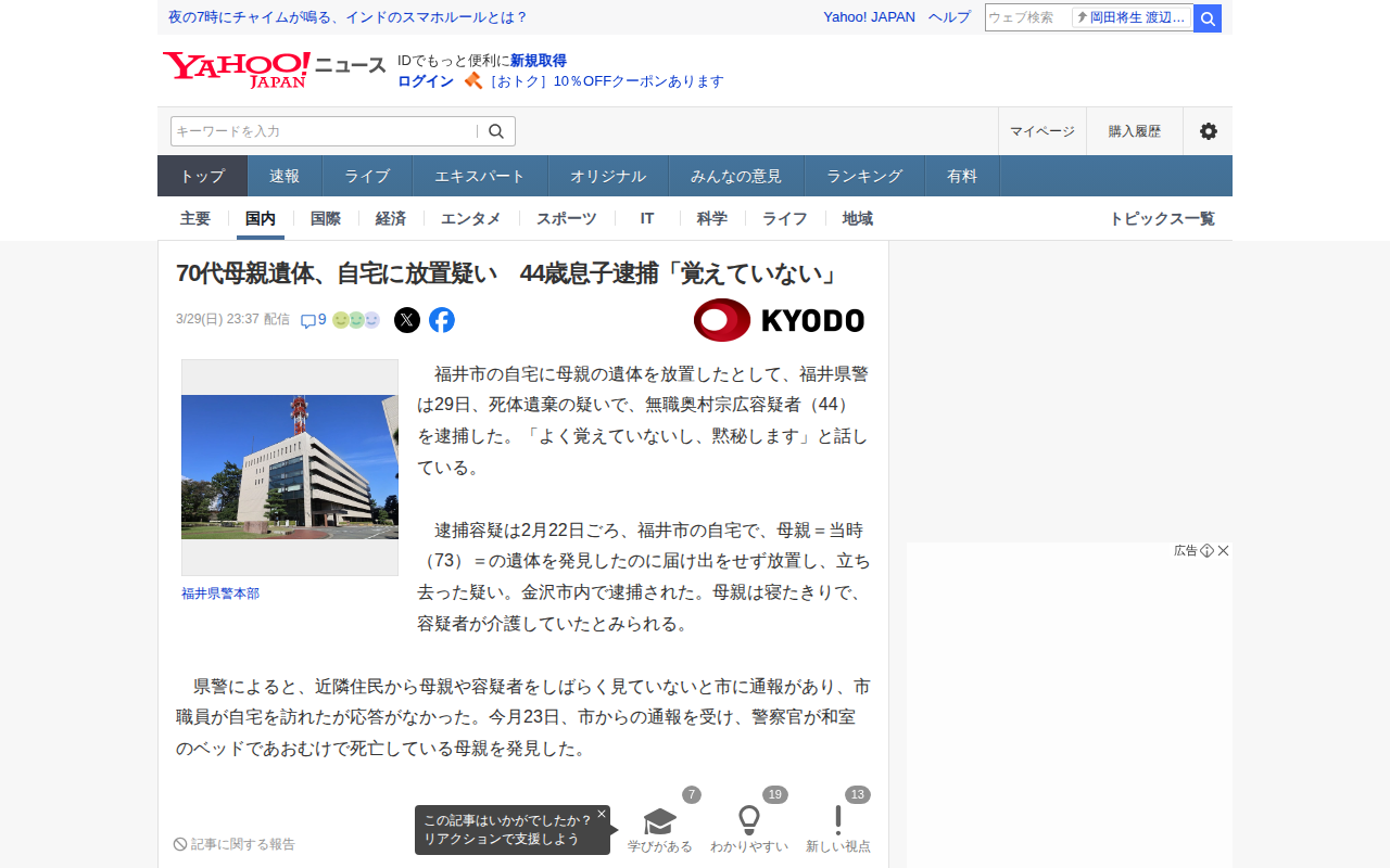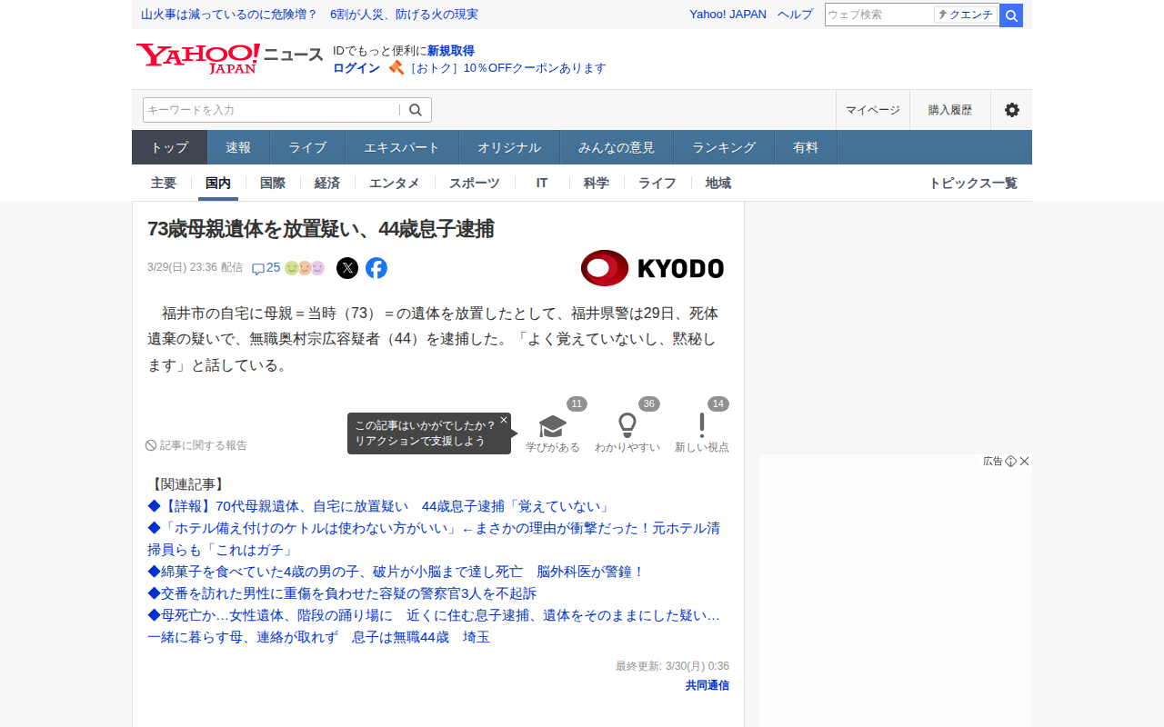 73歳母親遺体を放置疑い、44歳息子逮捕(共同通信) - Yahoo!ニュース