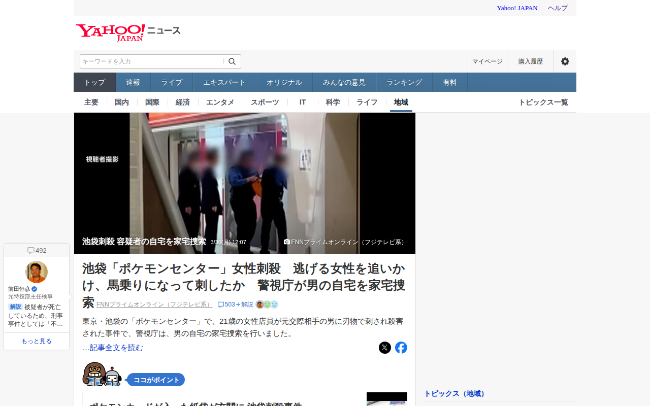 このページは、東京・池袋のポケモンセンターで21歳の女性店員が元交際相手の男に刃物で刺され殺害された事件について報じています。警視庁は容疑者の自宅を家宅捜索し、禁止命令の書類などを押収しました。男は交際解除後ストーカー化...