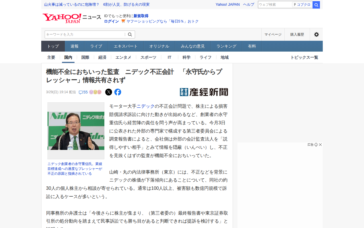 機能不全におちいった監査 ニデック不正会計 「永守氏からプレッシャー」情報共有されず(産経新聞) - Yahoo!ニュース
