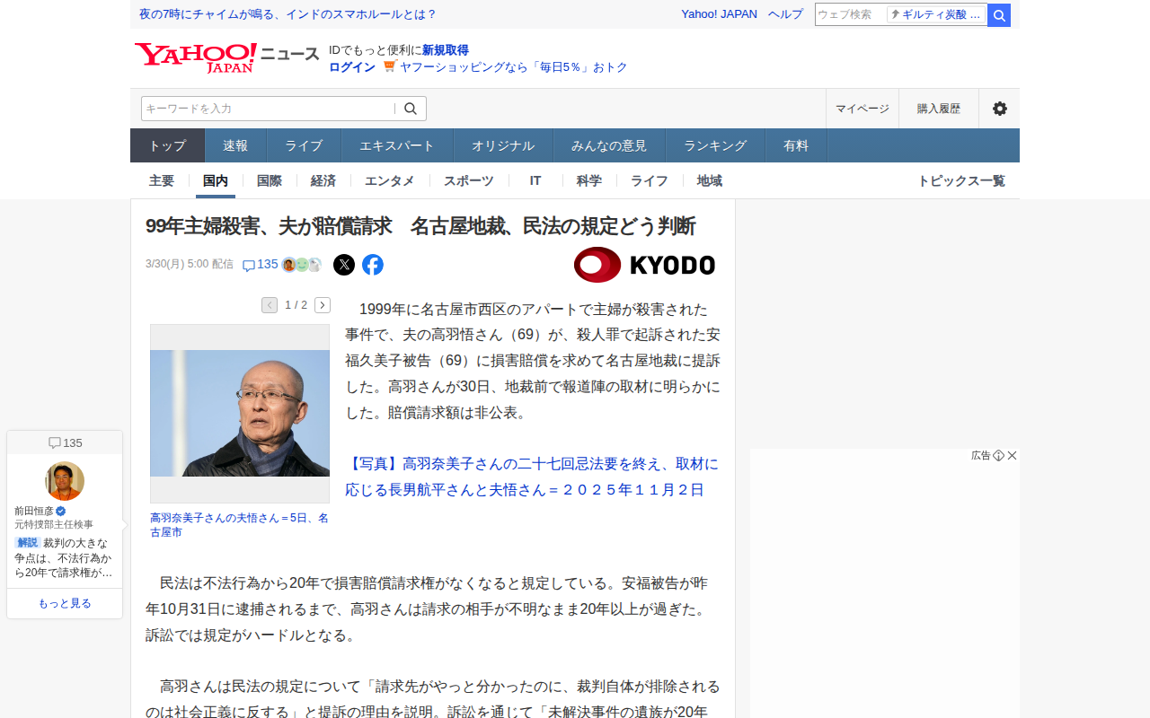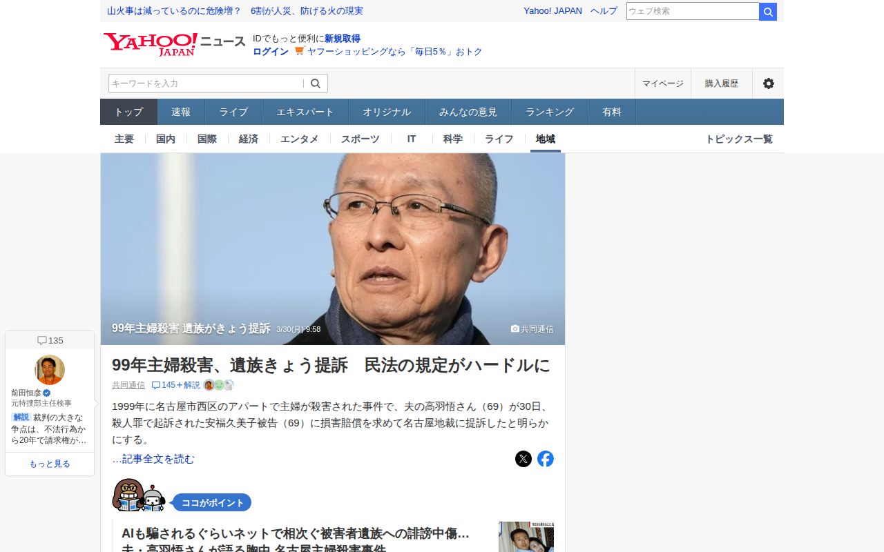 99年主婦殺害、夫が賠償請求 名古屋地裁、民法の規定どう判断(共同通信) - Yahoo!ニュース