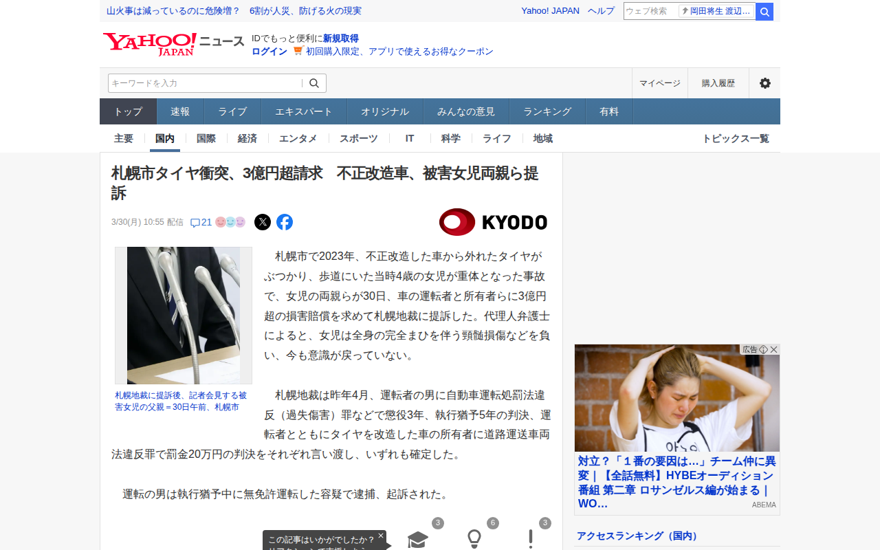 札幌市タイヤ衝突、3億円超請求 不正改造車、被害女児両親ら提訴(共同通信) - Yahoo!ニュース