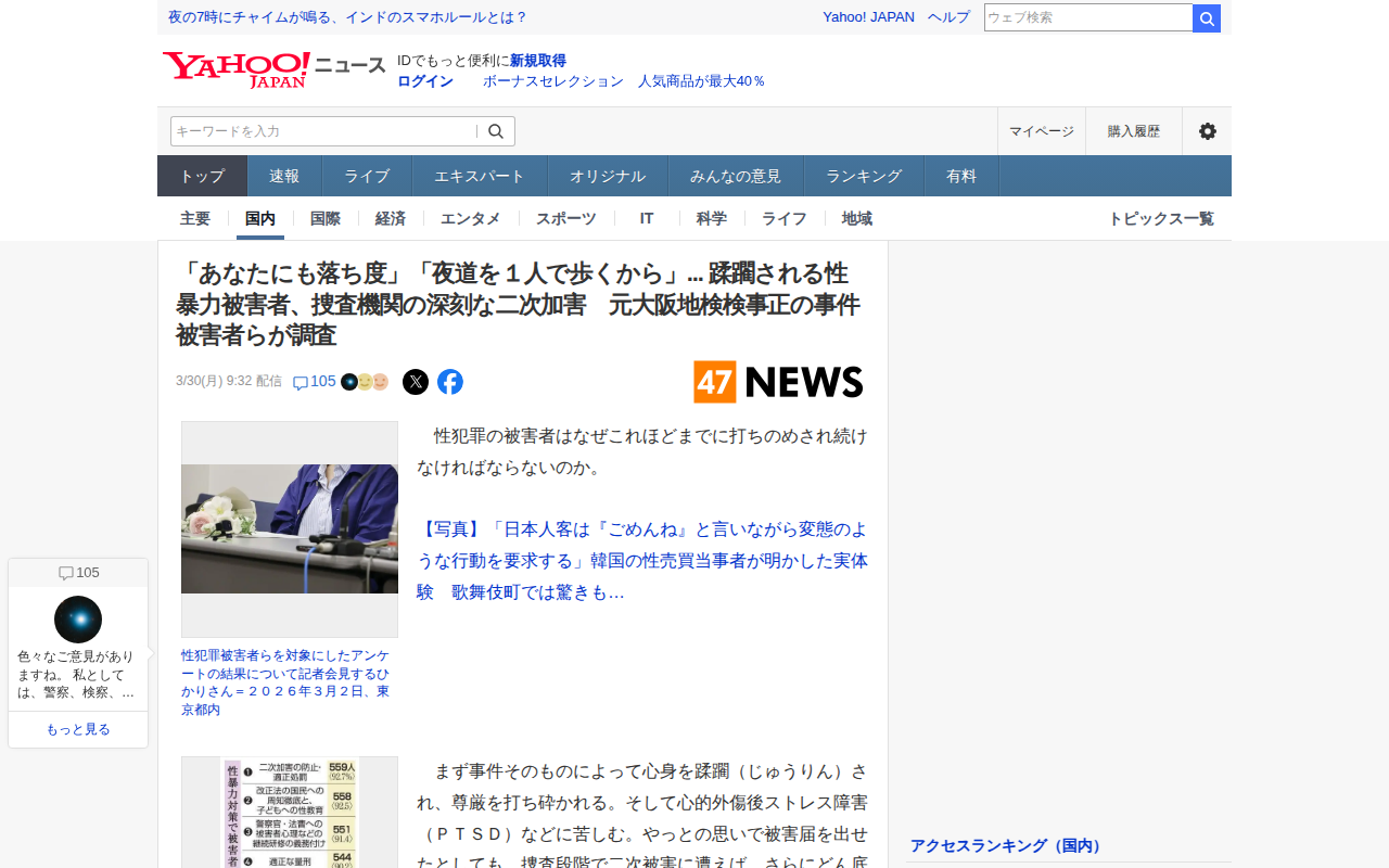 「あなたにも落ち度」「夜道を1人で歩くから」... 蹂躙される性暴力被害者、捜査機関の深刻な二次加害 元大阪地検検事正の事件被害者らが調査(47NEWS) - Yahoo!ニュース