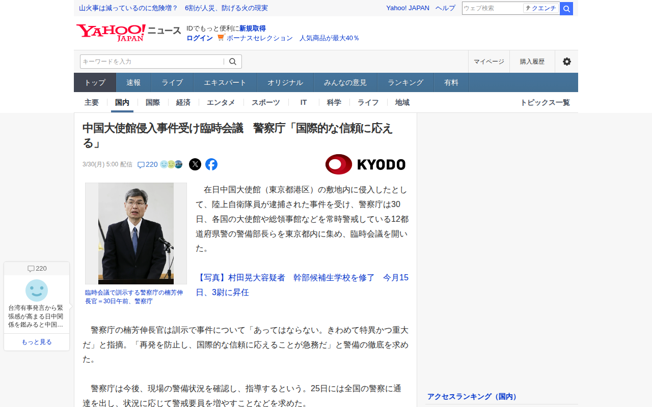 中国大使館侵入事件受け臨時会議 警察庁「国際的な信頼に応える」(共同通信) - Yahoo!ニュース