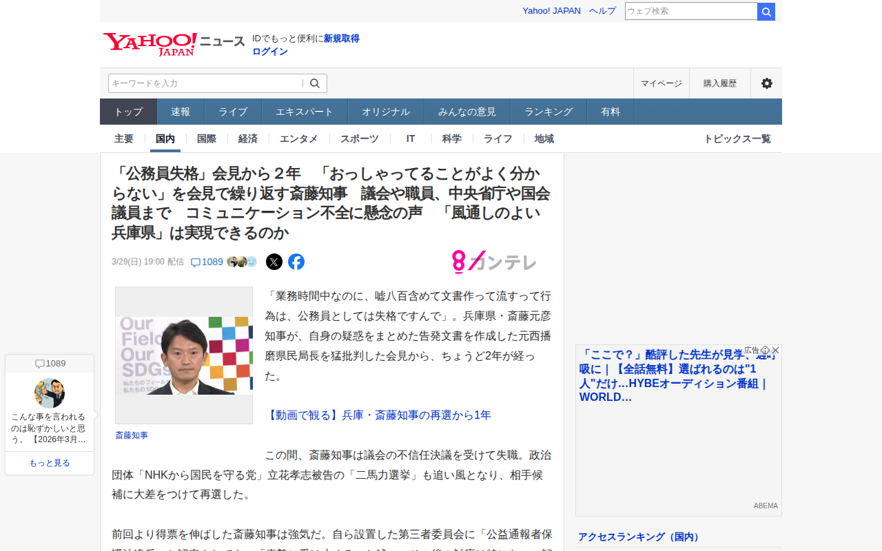 このページは、兵庫県の斎藤元彦知事のコミュニケーション問題を報じている。2年前の「公務員失格」発言から現在まで、知事は議会や職員との間で不信任決議を受け一度失職したが、再選された。しかし第三者委員会から公益通報者保護法違...