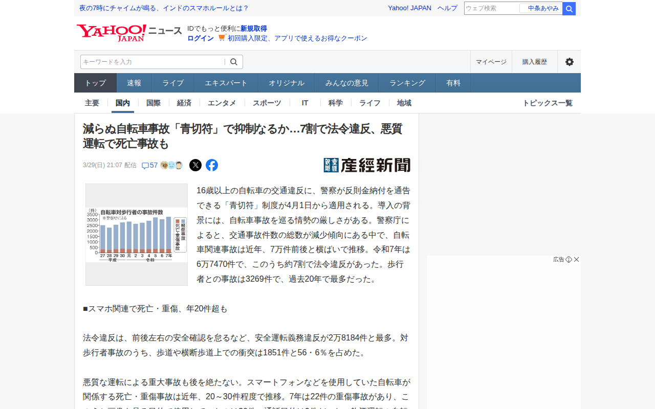 減らぬ自転車事故「青切符」で抑制なるか…7割で法令違反、悪質運転で死亡事故も(産経新聞) - Yahoo!ニュース