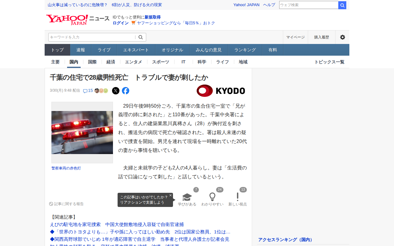 千葉の住宅で28歳男性死亡 トラブルで妻が刺したか(共同通信) - Yahoo!ニュース