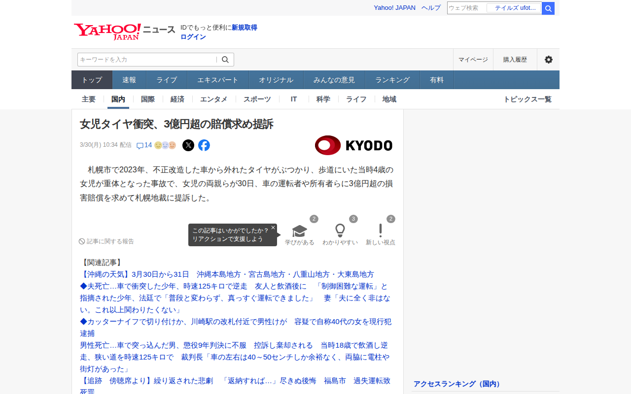 女児タイヤ衝突、3億円超の賠償求め提訴(共同通信) - Yahoo!ニュース