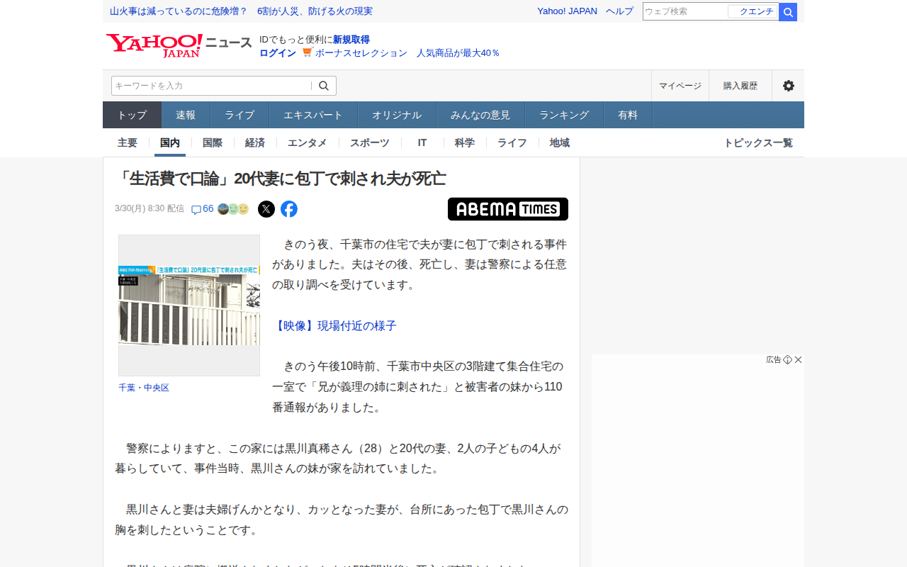 「生活費で口論」20代妻に包丁で刺され夫が死亡(ABEMA TIMES) - Yahoo!ニュース