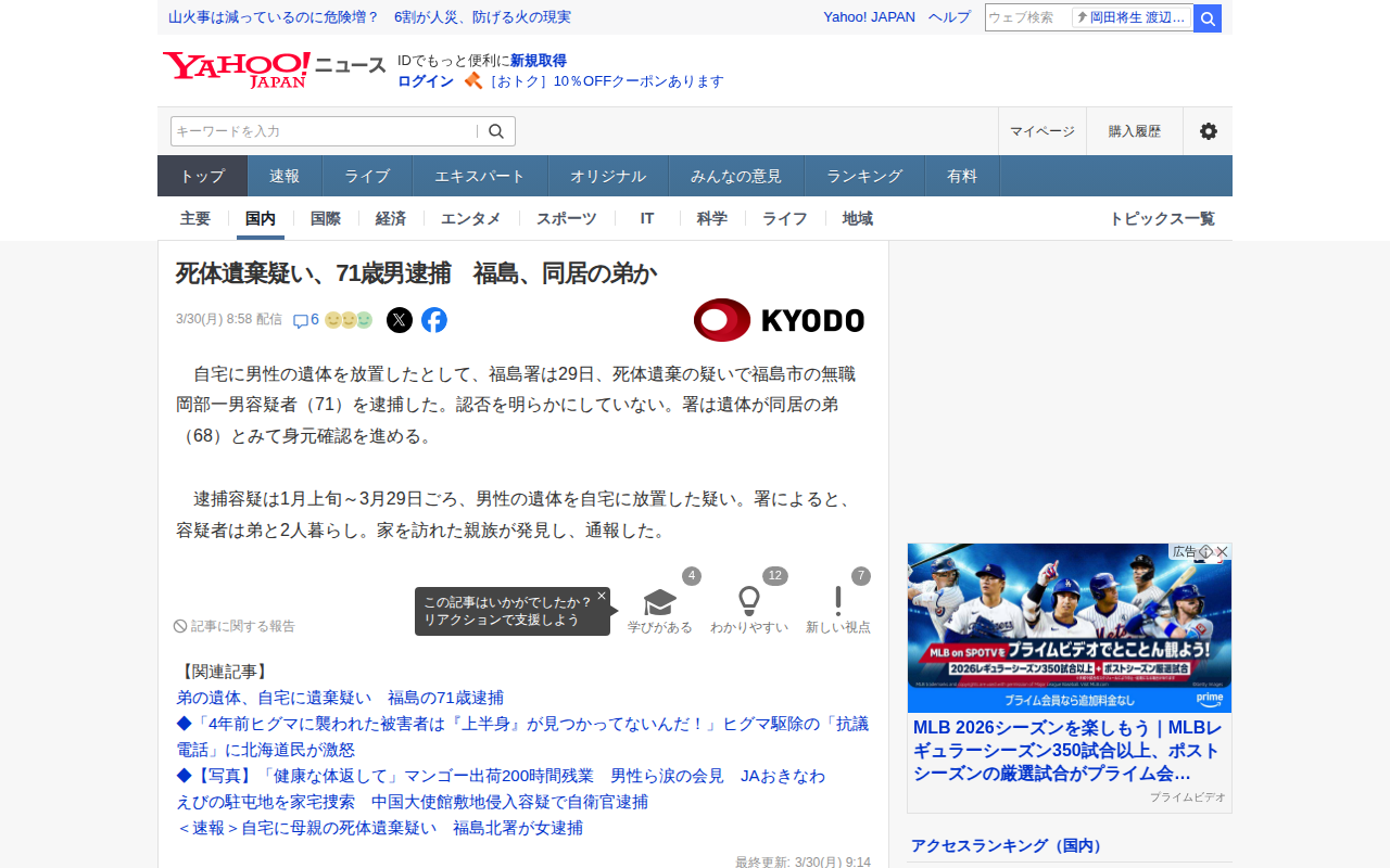 死体遺棄疑い、71歳男逮捕 福島、同居の弟か(共同通信) - Yahoo!ニュース