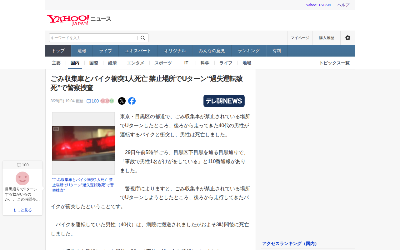 このページは、東京・目黒区の目黒通りで発生した交通事故を報じるニュース記事です。ごみ収集車が禁止されている場所でUターンしようとした際、後ろから走行してきた40代男性のバイクと衝突しました。バイク運転者は病院に搬送されま...