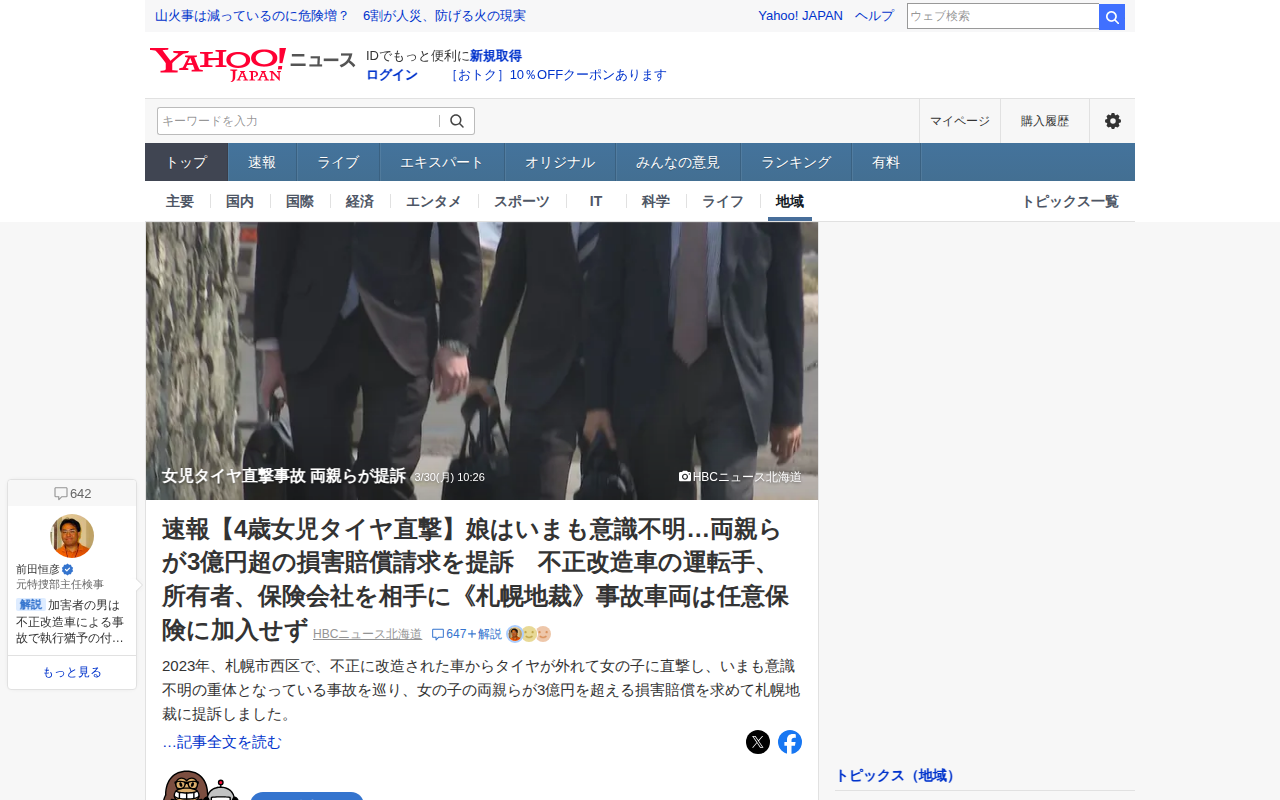 このページは、2023年に札幌市西区で発生した不正改造車からタイヤが外れて4歳女児に直撃した事故に関するニュースです。女児はいまも意識不明の重体にあります。両親らが運転手、車両所有者、保険会社を相手に3億円を超える損害賠...