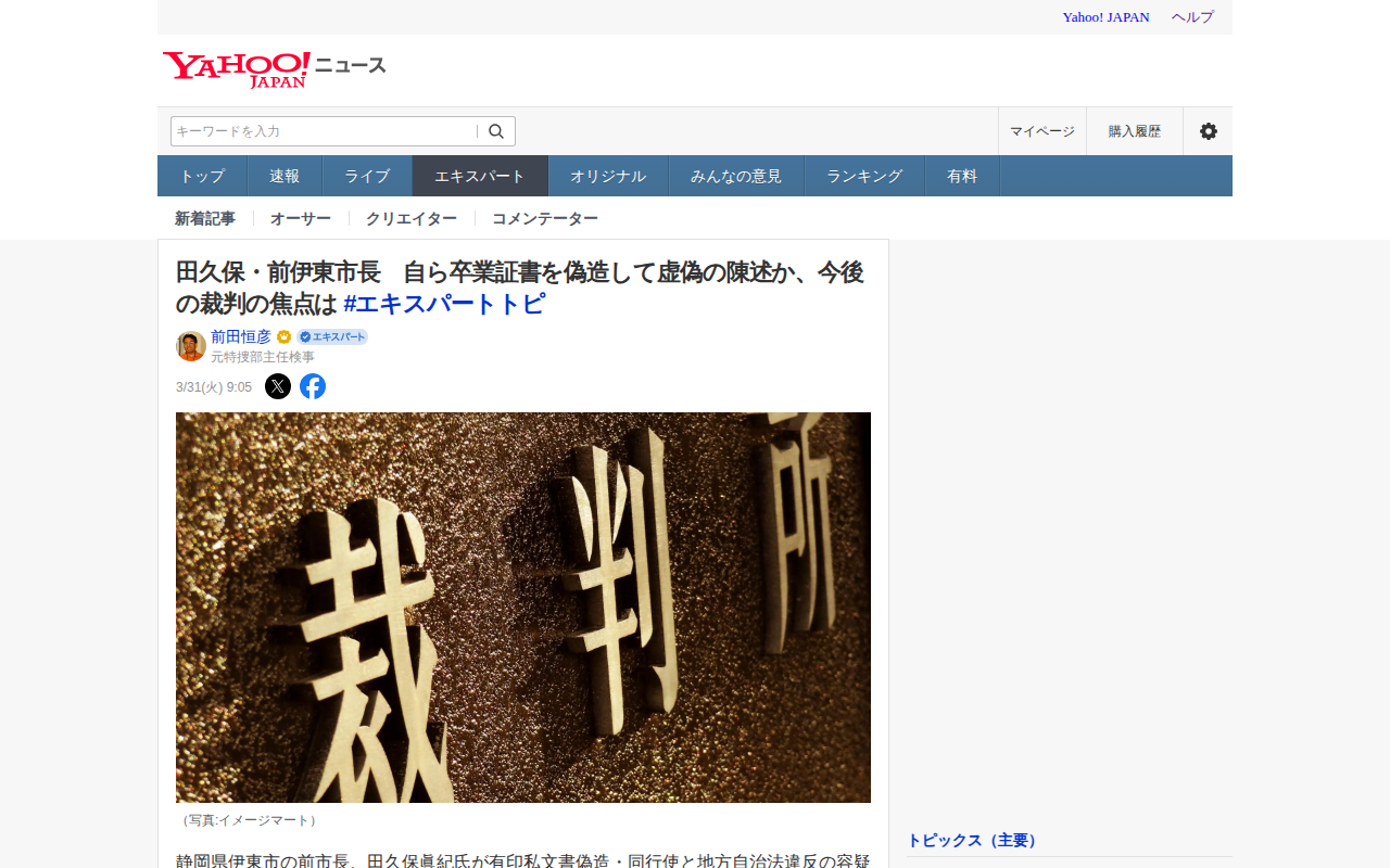 田久保・前伊東市長 自ら卒業証書を偽造して虚偽の陳述か、今後の裁判の焦点は #エキスパートトピ(前田恒彦) - エキスパート - Yahoo!ニュース
