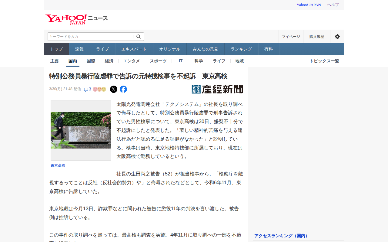 特別公務員暴行陵虐罪で告訴の元特捜検事を不起訴 東京高検(産経新聞) - Yahoo!ニュース