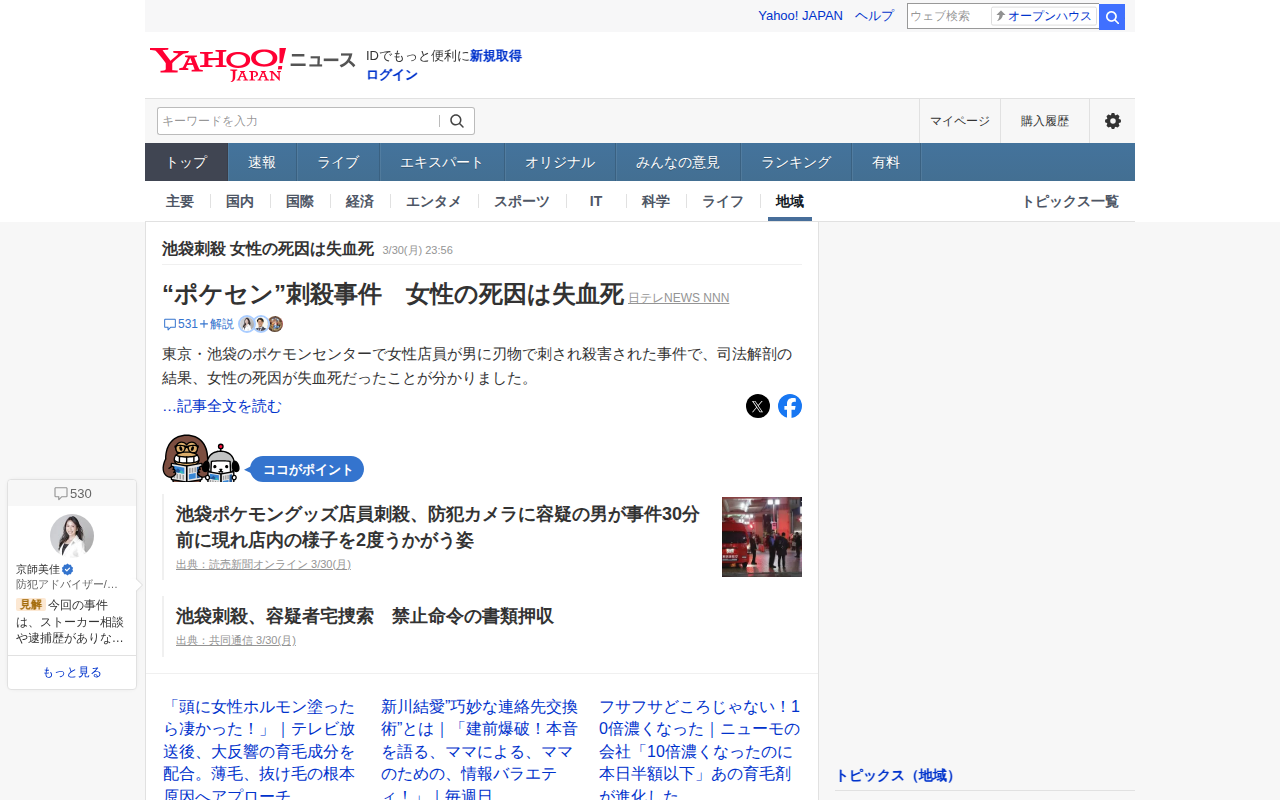 池袋刺殺 女性の死因は失血死 - Yahoo!ニュース