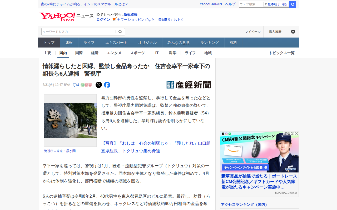 情報漏らしたと因縁、監禁し金品奪ったか 住吉会幸平一家傘下の組長ら6人逮捕 警視庁(産経新聞) - Yahoo!ニュース