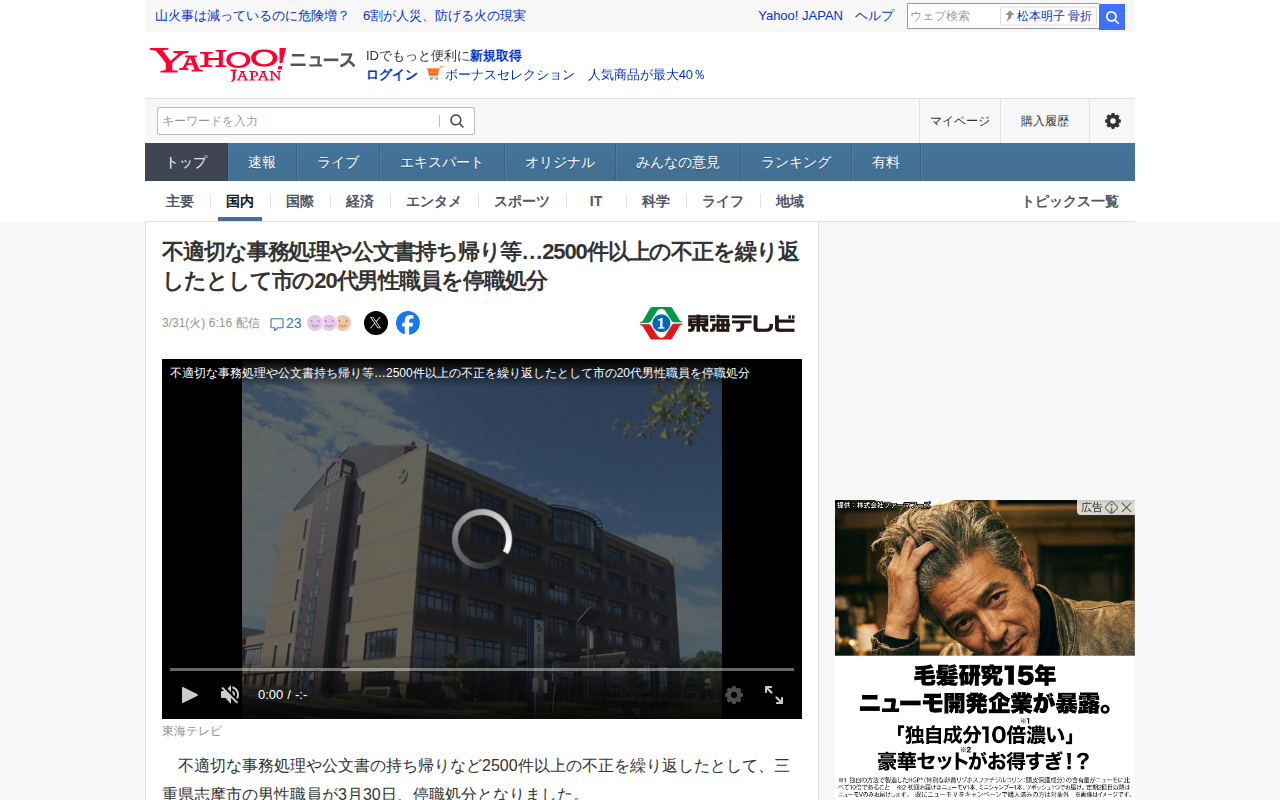 不適切な事務処理や公文書持ち帰り等…2500件以上の不正を繰り返したとして市の20代男性職員を停職処分(東海テレビ) - Yahoo!ニュース