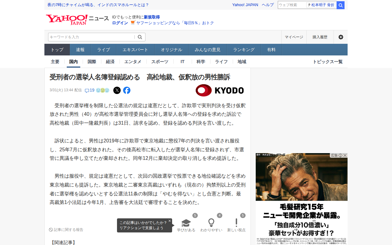 このページは、詐欺罪で実刑判決を受け仮釈放された40代男性が、高松市選挙管理委員会を相手に選挙人名簿への登録を求めた訴訟について報じています。高松地裁は3月31日、受刑者の選挙権を制限する公選法11条の規定は違憲であると...