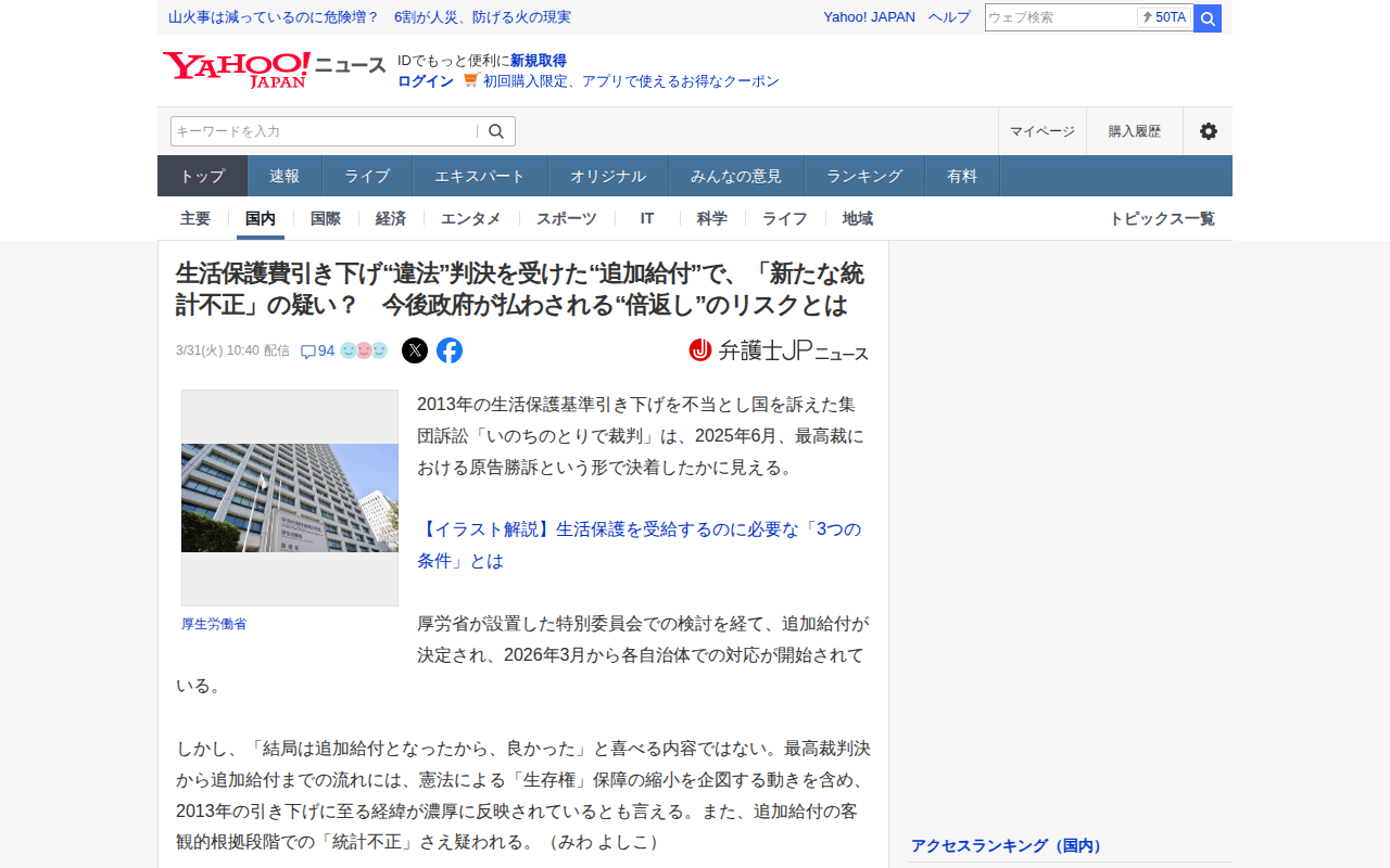 生活保護費引き下げ“違法”判決を受けた“追加給付”で、「新たな統計不正」の疑い? 今後政府が払わされる“倍返し”のリスクとは(弁護士JPニュース) - Yahoo!ニュース