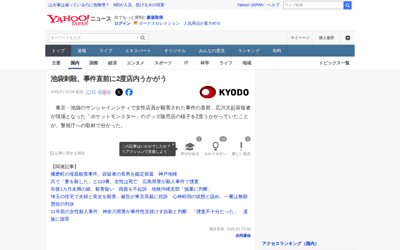 池袋刺殺、事件直前に2度店内うかがう(共同通信) - Yahoo!ニュース