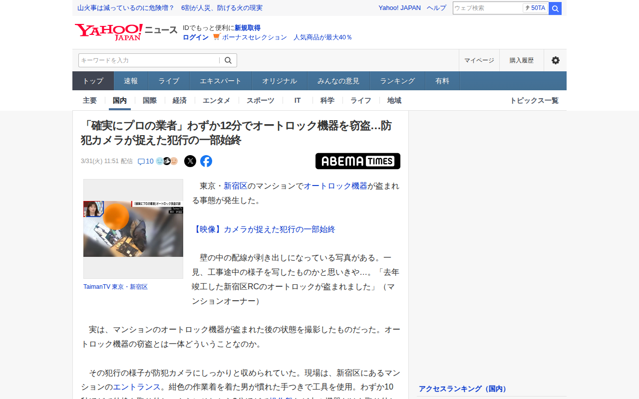 このページは、東京・新宿区のマンションでオートロック機器が盗まれた事件について報道している。防犯カメラに映された犯行は、紺色の作業着を着た男がわずか12分で機器を取り外し、持ち去るというもの。男は工具を使い慣れた手つきで...
