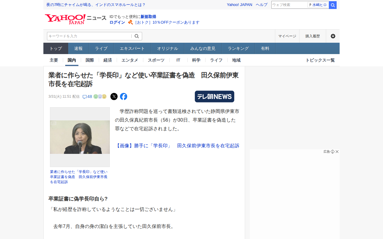 このページは、静岡県伊東市の田久保真紀前市長が卒業証書を偽造した罪などで在宅起訴されたことを報じています。田久保前市長は学歴を詐称する目的で、去年5月から6月にかけて、業者に作らせた偽の学長印などを使用して東洋大学の卒業...