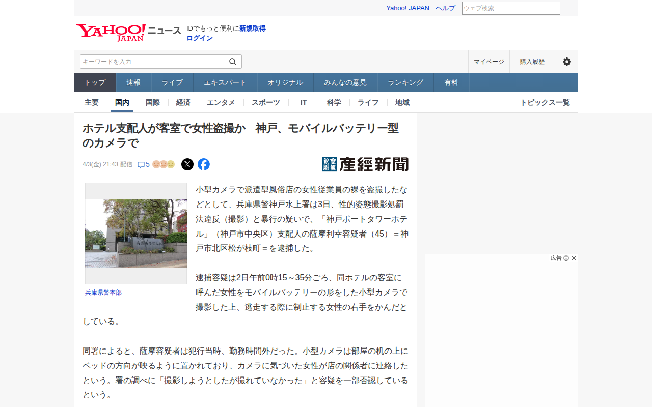 このページは、神戸のホテル支配人が客室で派遣型風俗店の女性をモバイルバッテリー型の小型カメラで盗撮したとして逮捕された事件を報じています。容疑者は4月2日深夜、女性を撮影した後、逃走を制止する女性の右手をかんだ疑いで、性...