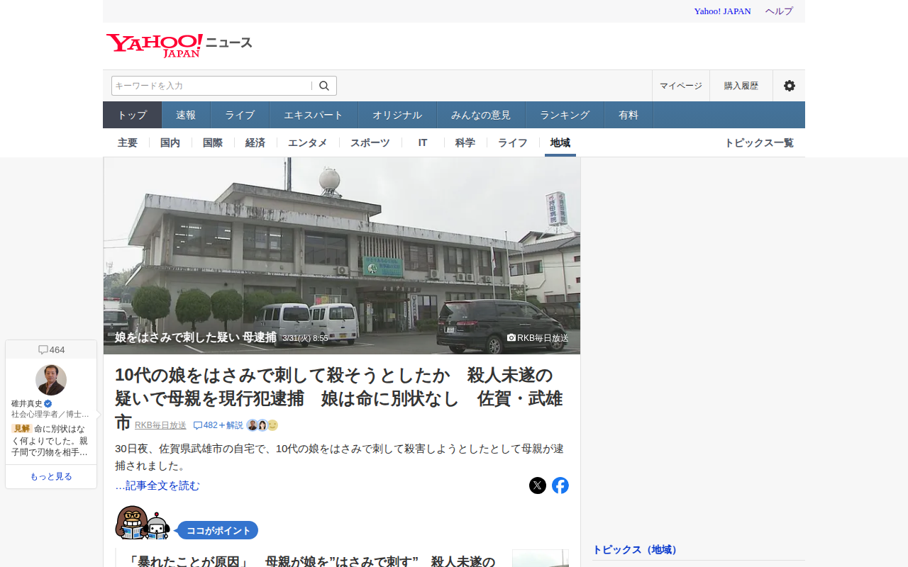 このページは、佐賀県武雄市で3月30日夜に発生した事件を報じています。10代の娘が母親によってはさみで刺され、殺人未遂容疑で母親が現行犯逮捕されました。娘は命に別状なく無事です。母親は「娘が暴れたことが原因」と述べていま...