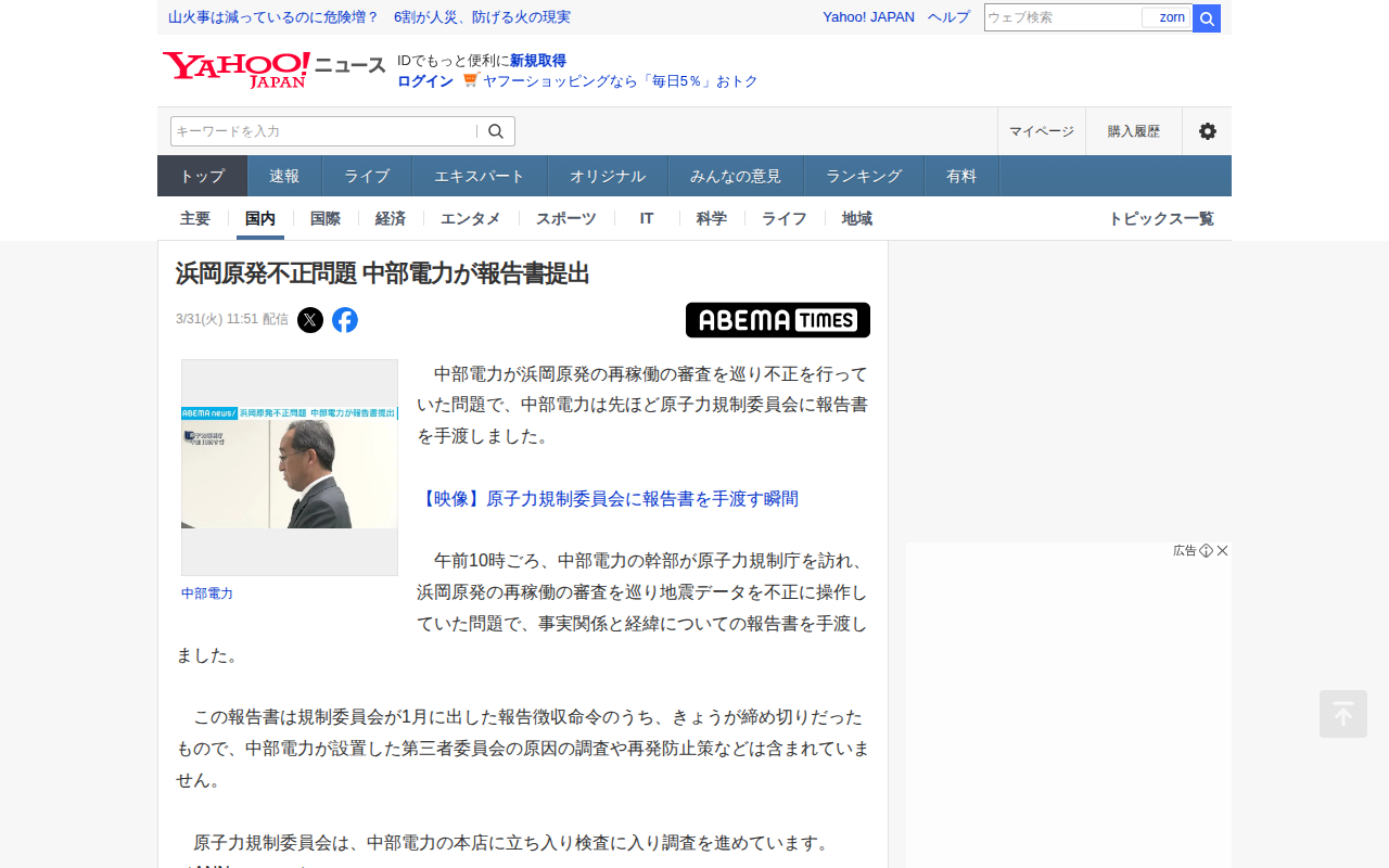 浜岡原発不正問題 中部電力が報告書提出(ABEMA TIMES) - Yahoo!ニュース