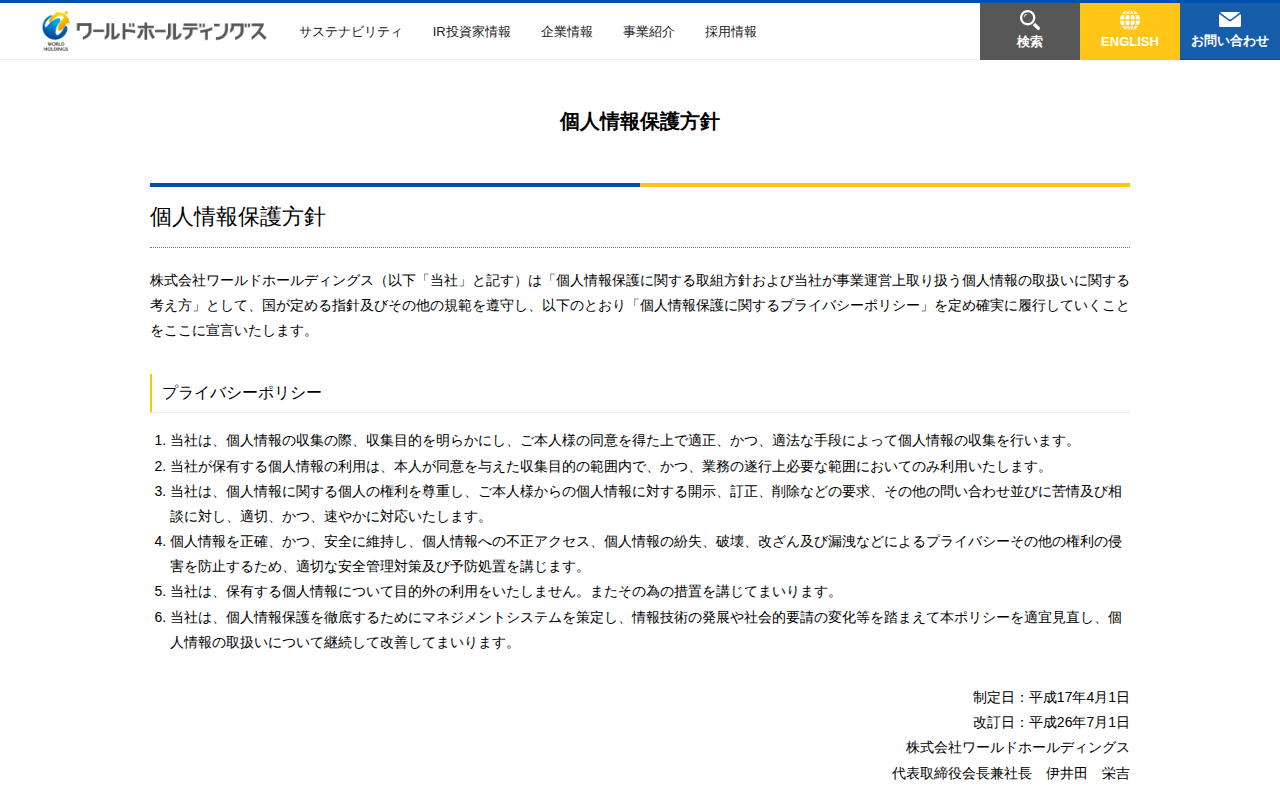 個人情報保護方針 | 株式会社ワールドホールディングス