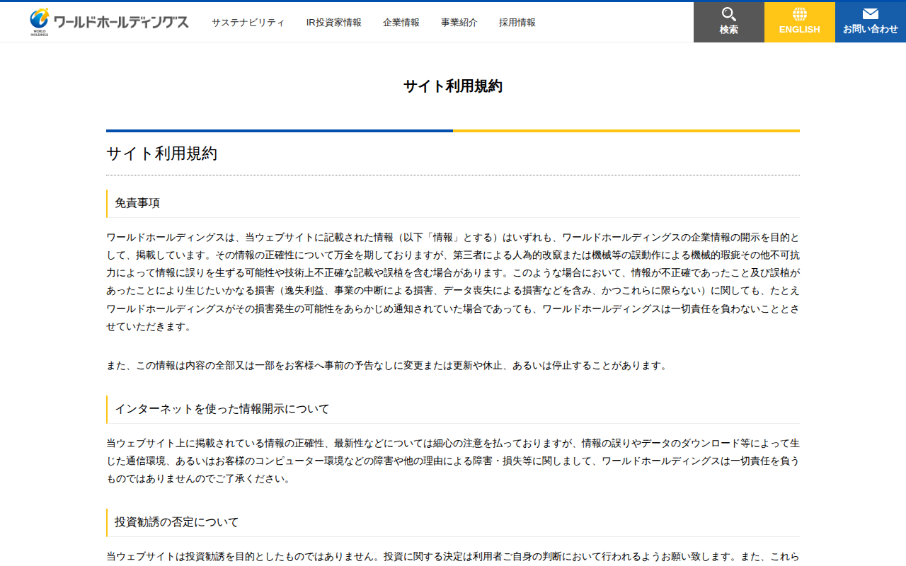 このページは株式会社ワールドホールディングスのサイト利用規約です。ウェブサイトに掲載された情報は企業情報開示を目的としており、正確性に努めていますが、人為的改竄やシステムエラーなどで誤りが生じる可能性があります。情報の不...
