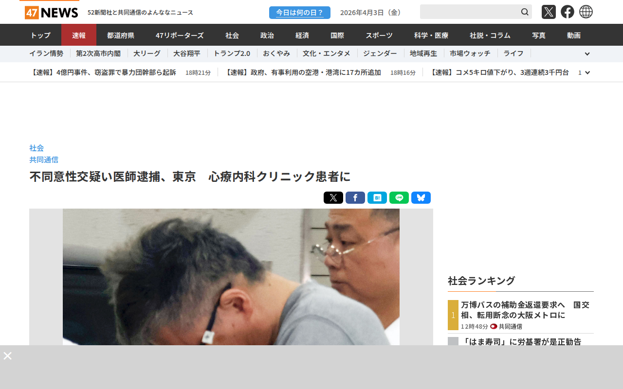 不同意性交疑い医師逮捕、東京 心療内科クリニック患者に|47NEWS(よんななニュース)