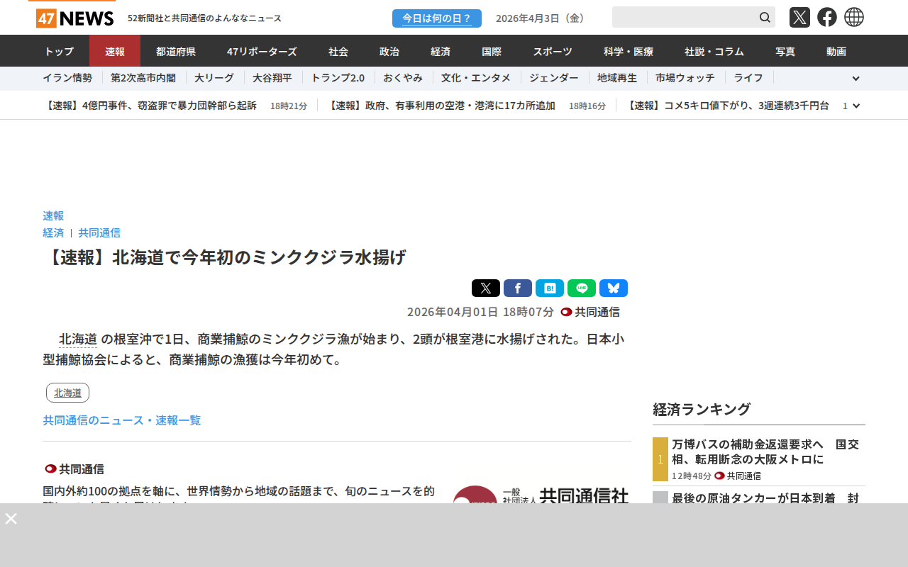 このページは、北海道の根室沖で4月1日に始まった商業捕鯨のミンククジラ漁についての速報記事である。根室港に2頭のミンククジラが水揚げされ、日本小型捕鯨協会によると、これは今年初めての商業捕鯨漁獲となる。記事は47NEWS...