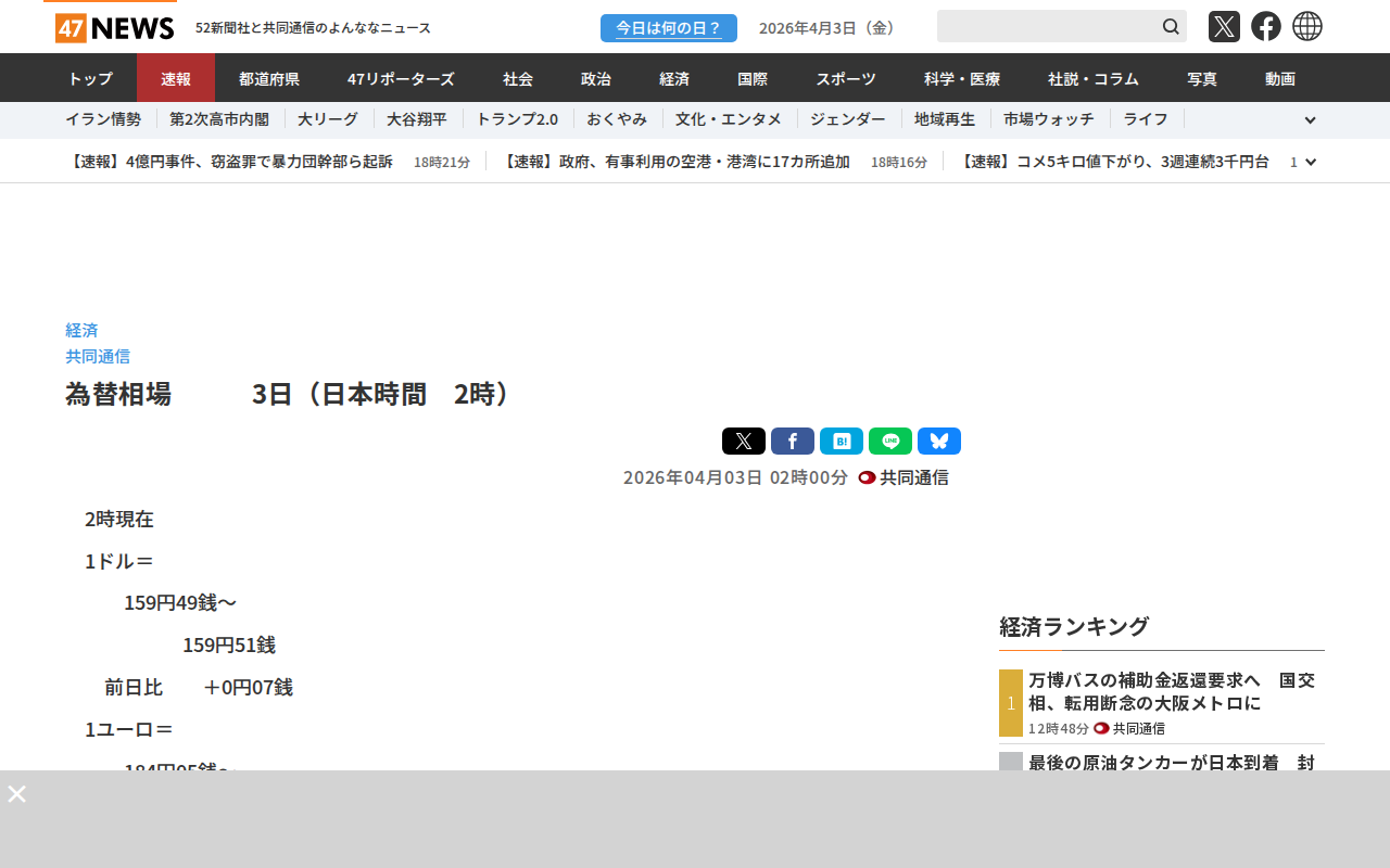 このページは、2026年4月3日午前2時時点の為替相場を報道するニュース記事です。共同通信が提供する為替情報として、1ドル159円49銭~159円51銭、1ユーロ184円05銭~184円06銭の相場を掲載しています。前日...