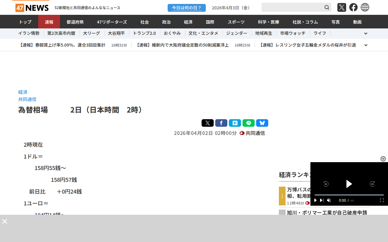 このページは、2026年4月2日午前2時時点の為替相場情報を掲載している。1ドルは158円55銭~158円57銭で、前日比0円24銭の円安。1ユーロは184円14銭~184円18銭で、前日比0円24銭の円高。共同通信が世...