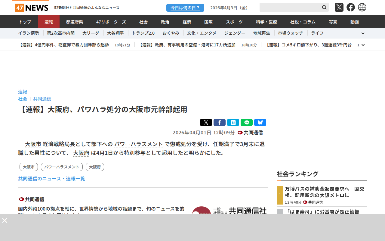 このページは、大阪市経済戦略局長として部下へのパワーハラスメントで懲戒処分を受け、3月末に退職した男性を、大阪府が4月1日から特別参与として起用したことを報じた速報記事である。パワハラで処分された人物の再起用について、府...
