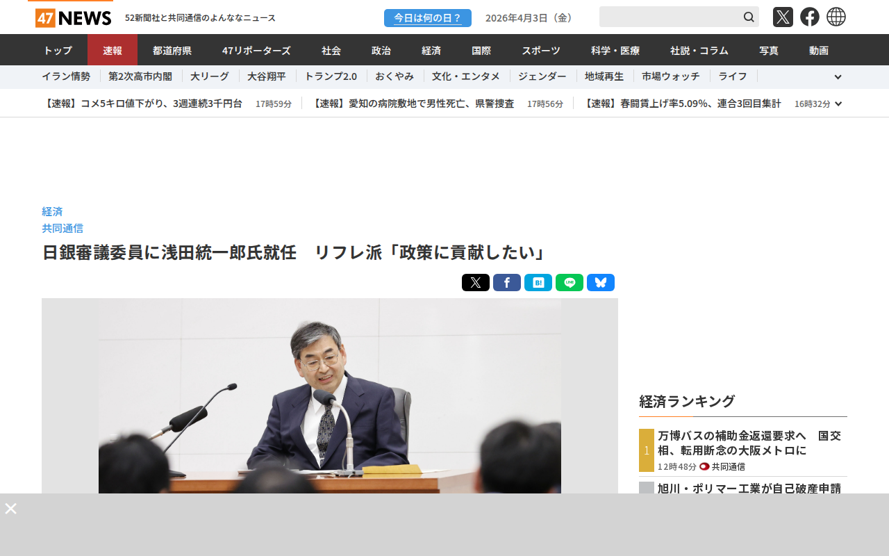 日銀審議委員に浅田統一郎氏就任 リフレ派「政策に貢献したい」|47NEWS(よんななニュース)