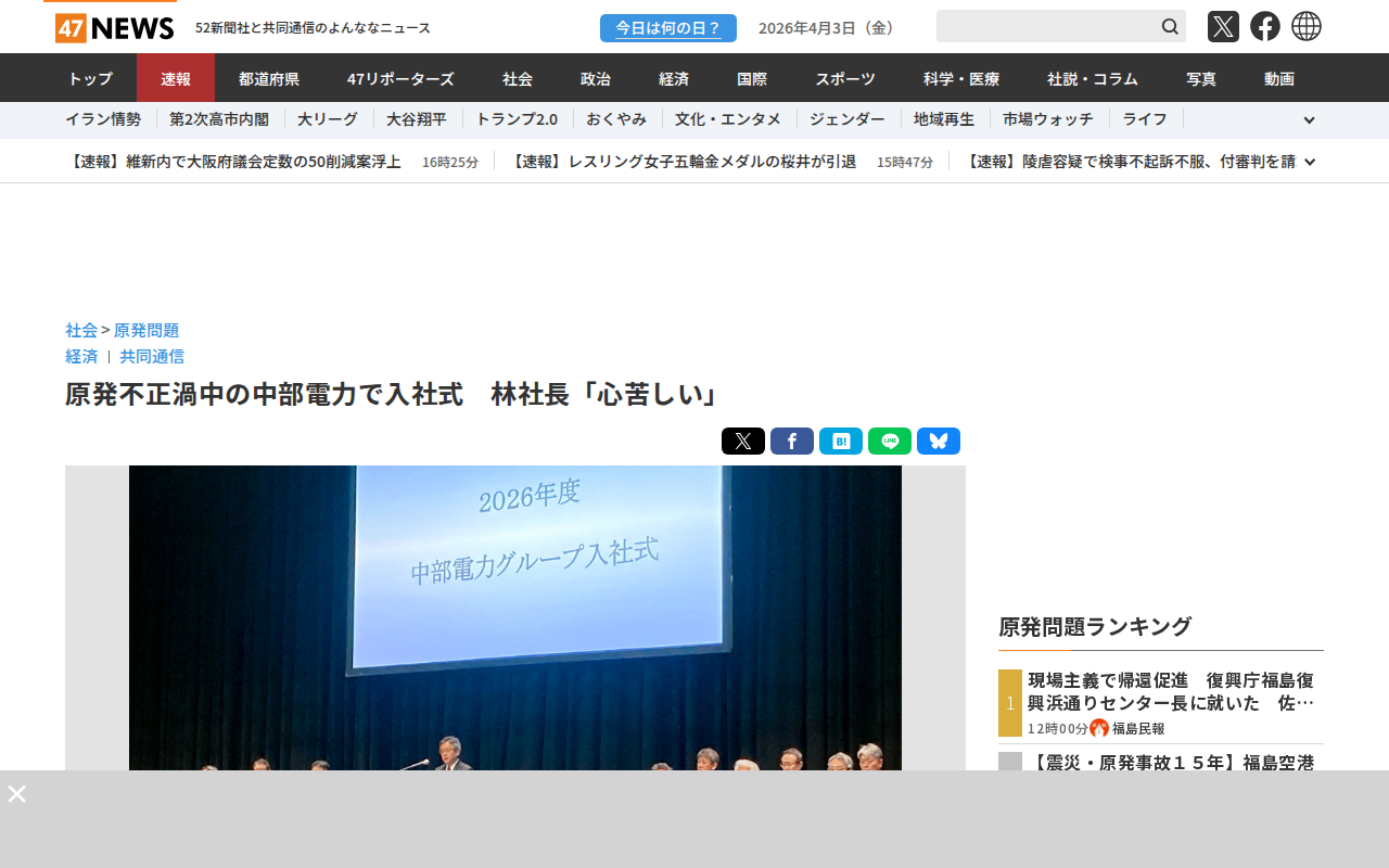 このページは、中部電力が2026年4月1日に名古屋市で開催した入社式について報じたニュース記事である。浜岡原発の耐震設計データ不正問題の渦中で行われた式典で、林欣吾社長は新入社員に不安を与えていることへの心苦しさを述べた...