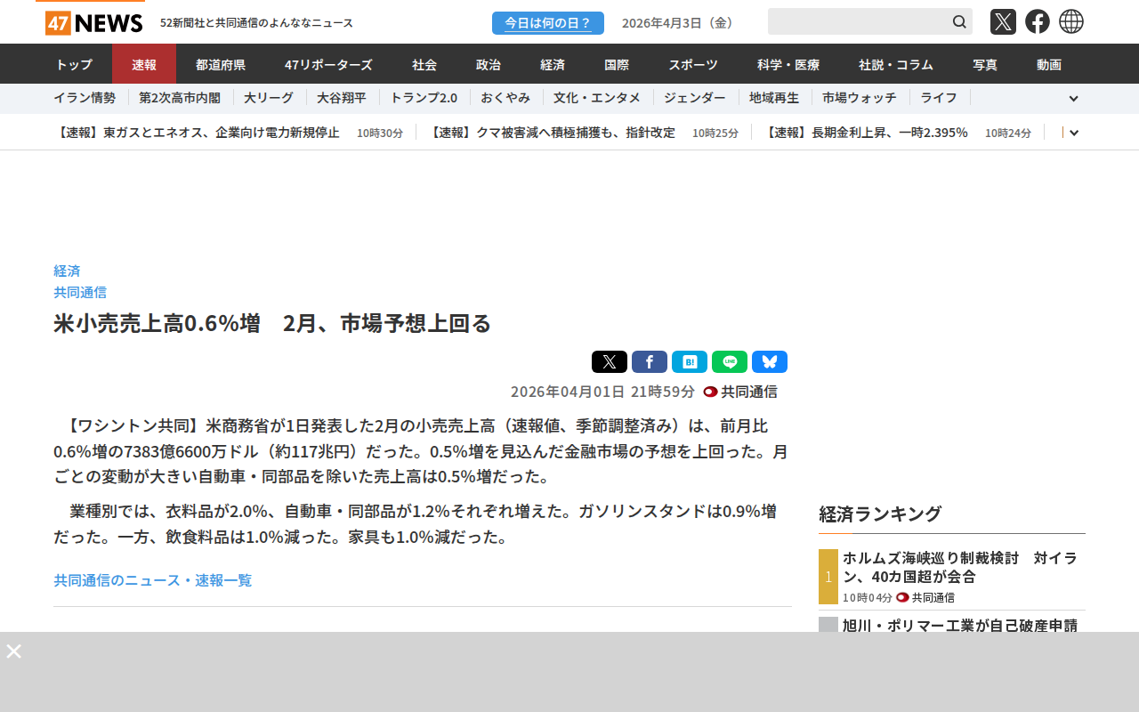 米小売売上高0.6%増 2月、市場予想上回る|47NEWS(よんななニュース)
