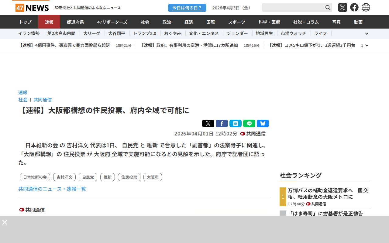 このページは、日本維新の会の吉村洋文代表が、自民党と維新で合意した「副首都」の法案骨子に関連して、「大阪都構想」の住民投票が大阪府全域で実施可能になるとの見解を示したことを報じた速報記事である。2026年4月1日に府庁で...