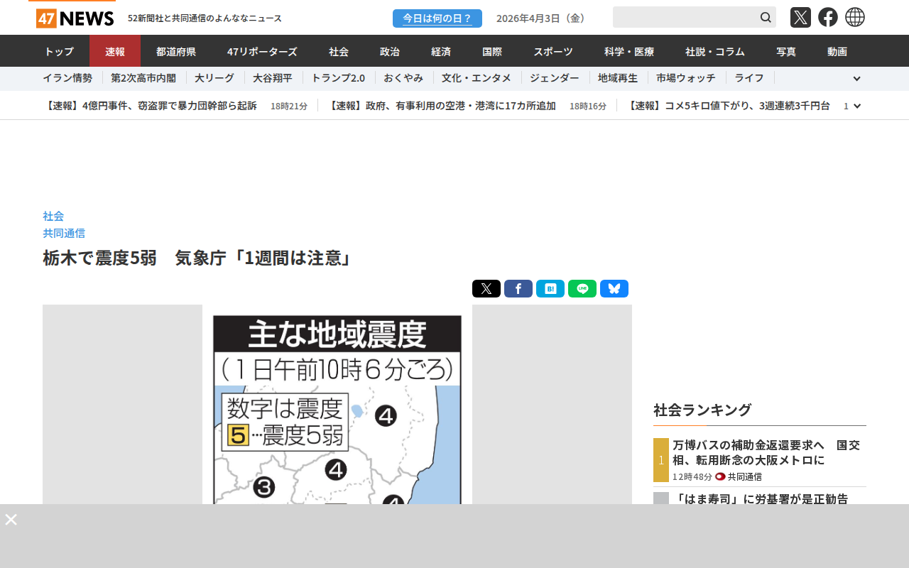 栃木で震度5弱 気象庁「1週間は注意」|47NEWS(よんななニュース)