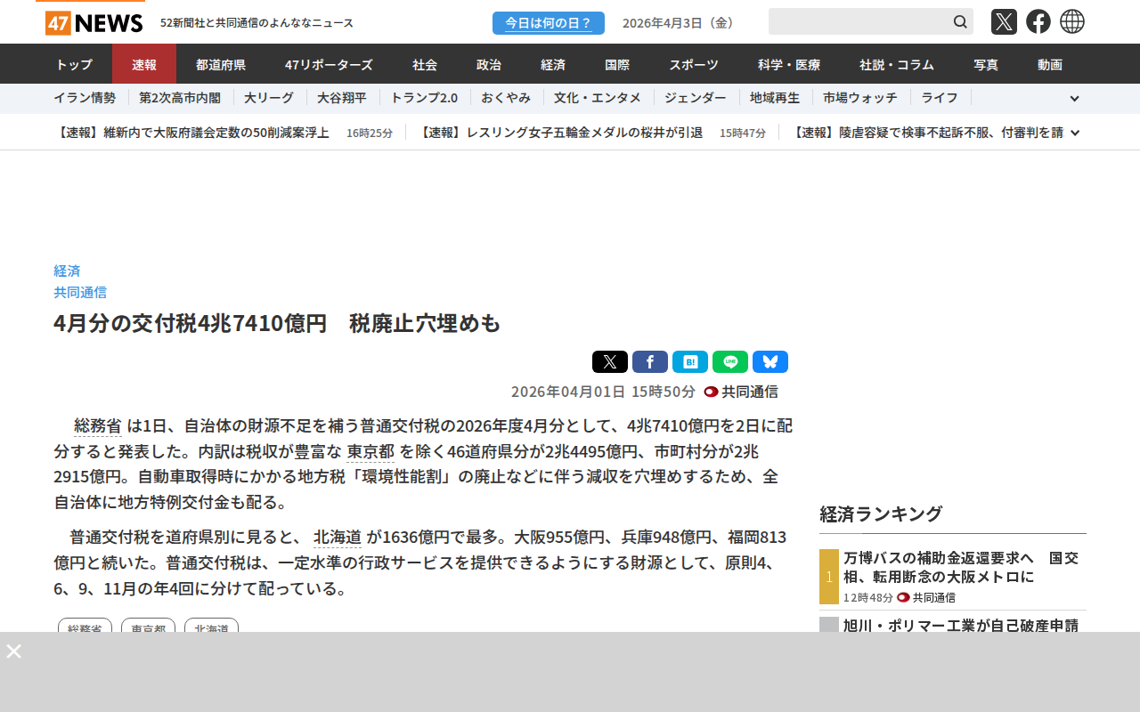 このページは、総務省が2026年度4月分として自治体に配分する普通交付税4兆7410億円について報じています。内訳は道府県分が2兆4495億円、市町村分が2兆2915億円。環境性能割など地方税の廃止に伴う減収を補うため、...