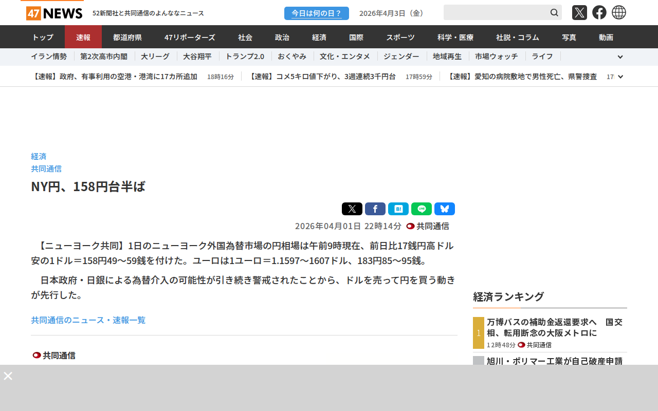 NY円、158円台半ば|47NEWS(よんななニュース)